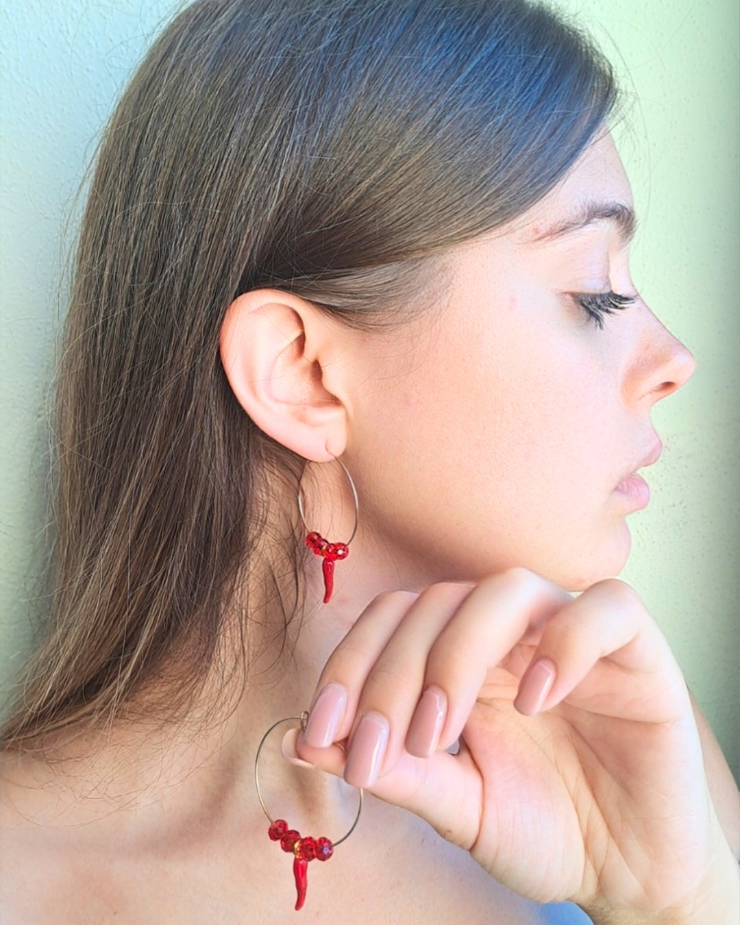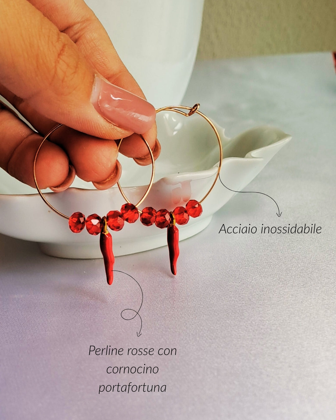 Orecchini realizzati in acciaio inossidabile con colorate perline rosse vivace e cornocino porta fortuna. Gli orecchini Mercado Central sono ispirati all’energia e alla bellezza della Spagna, per un look che parla di passione e avventura. Lasciati conquistare dal fascino spagnolo!
