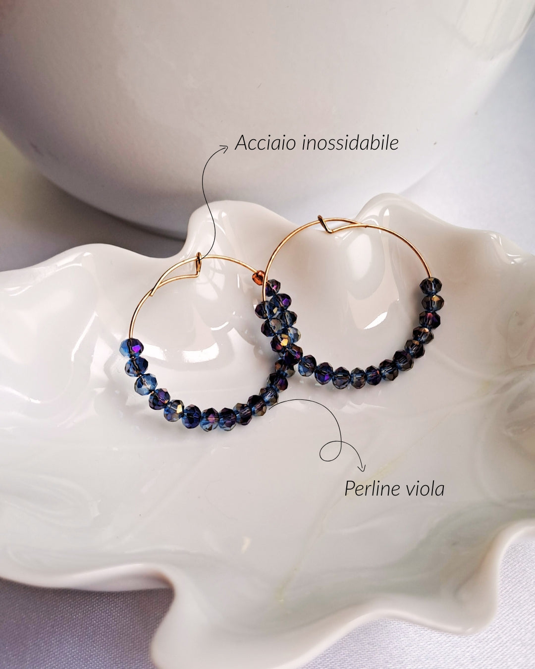 Orecchini realizzati in acciaio inossidabile con perline viola. Gli orecchini Provence sono un soffio di lavanda e luce dorata, un invito a perderti tra i colori delicati e i profumi intensi del Sud della Francia. Indossali e lascia che ogni giorno profumi di meraviglia.